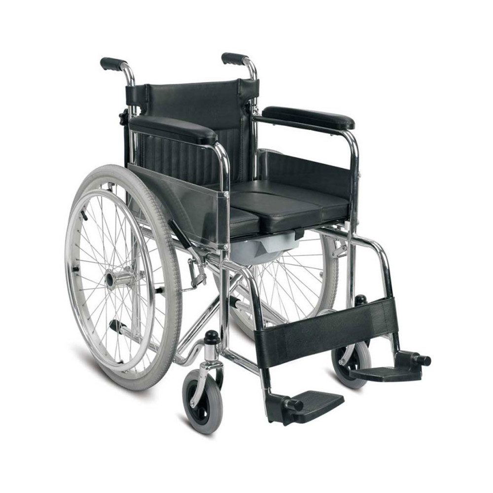 Πρακτικό αμαξίδιο τουαλέτα με αφαιρούμενο δοχείο WC, σχεδιασμένο για ασφαλή χρήση σε εσωτερικούς χώρους ή εξωτερικούς χώρους και εύκολη μεταφορά ασθενών. Ο μεταλλικός επιχρωμιωμένος σκελετός και τα ανακλινόμενα πλαϊνά διευκολύνουν την πρόσβαση και την καθημερινή φροντίδα. Πολύ στιβαρή κατασκευή, κατάλληλη για ασθενείς με μεγάλο βάρος έώς 135 kg.
