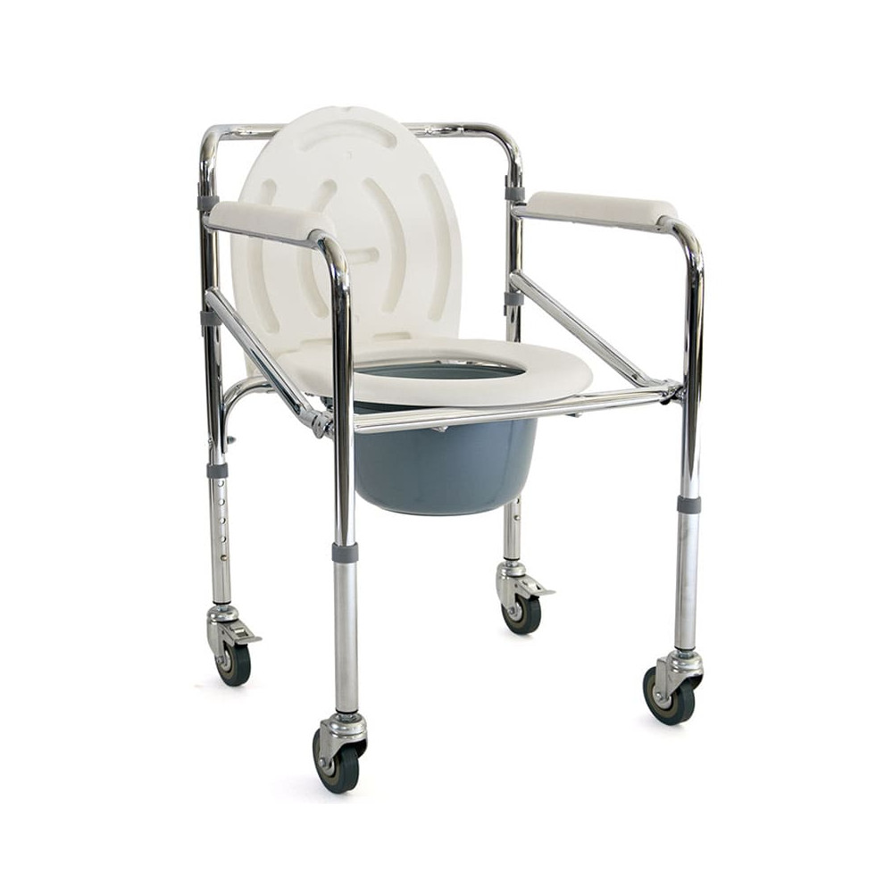 Πτυσσόμενη καρέκλα τουαλέτα με ρόδες από τη Vita Orthopaedics, κατασκευασμένη από επιχρωμιωμένο μεταλλικό σκελετό υψηλής αντοχής για βάρος έως 115 kg. Διαθέτει δοχείο WC που αφαιρείται, ρυθμιζόμενο ύψος και τροχούς με φρένα για ασφαλή χρήση.