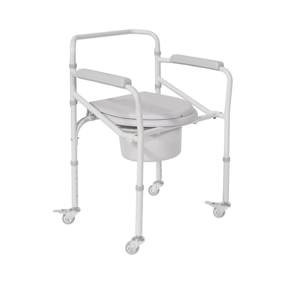 Πτυσσόμενη καρέκλα τουαλέτας με ρόδες από τη Mobiakcare, με ρυθμιζόμενο ύψος και φρένα σταθεροποίησης στους δύο οπίσθιους τροχούς. Ιδανική για μεταφορά του ασθενούς απευθείας πάνω από τη λεκάνη της τουαλέτας μετά την αφαίρεση του δοχείου.
