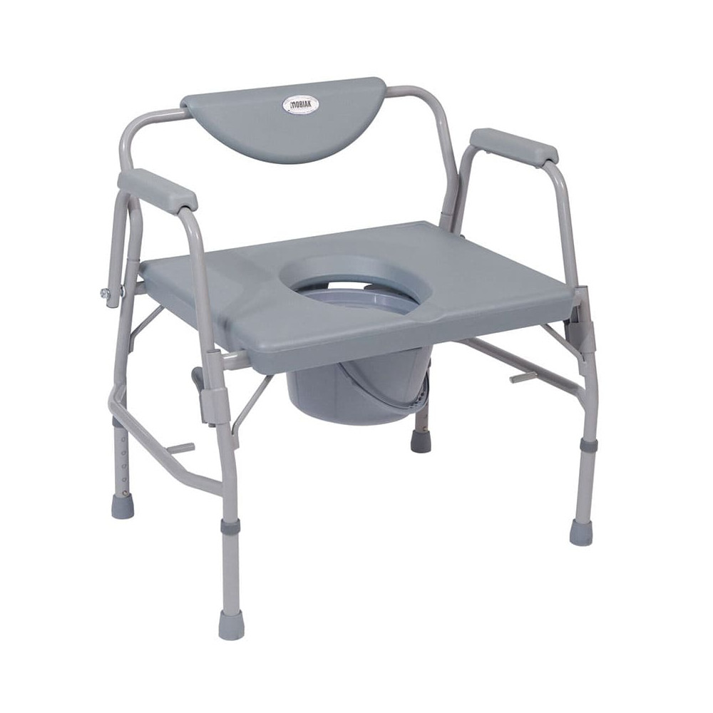 Κάθισμα τουαλέτας βαρέως τύπου με ενισχυμένο μεταλλικό σκελετό για υπέρβαρους χρήστες έως 225 kg. Διαθέτει πτυσσόμενα πλαϊνά και ρυθμιζόμενο ύψος για ευκολότερη πρόσβαση και άνεση.