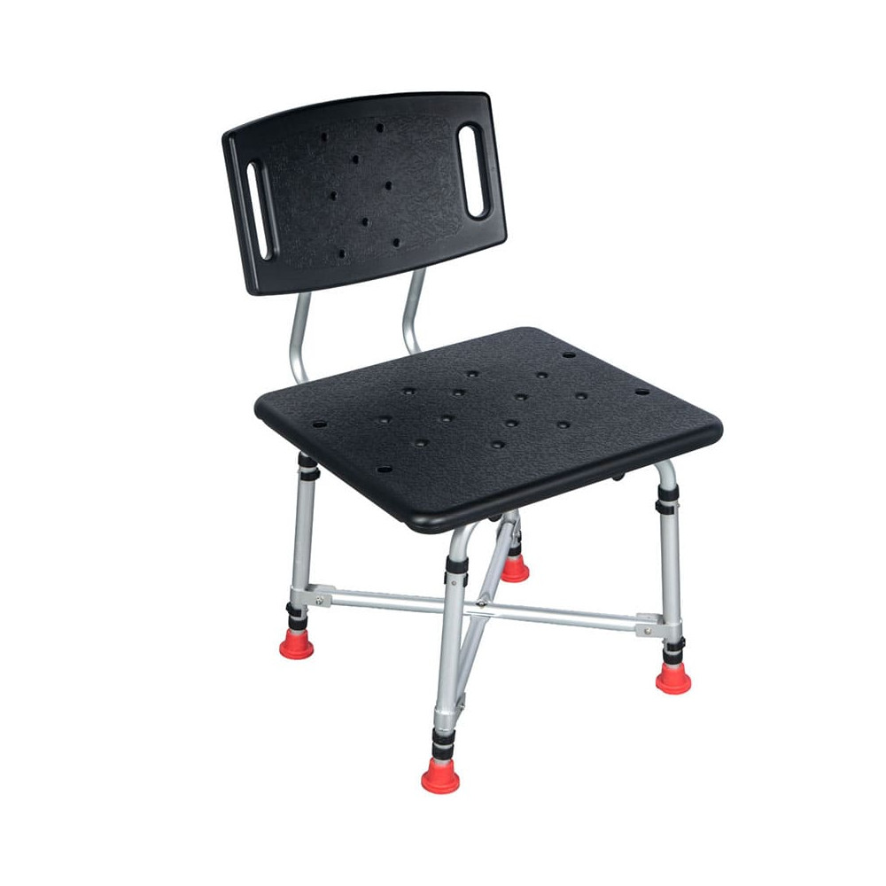 Καρέκλα μπάνιου για υπέρβαρους με πλάτη, αντιολισθητικό κάθισμα με πλάτος 55 cm και σταθερή μεταλλική βάση από τη Mobiakcare. Προσφέρει αυξημένη αντοχή έως 180 kg και διαθέτει ρυθμιζόμενα πόδια για προσαρμογή στο απαιτούμενο ύψος, ιδανική για χρήστες με περιορισμένη ισορροπία.