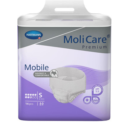 Αποκτήστε με 4 € όφελος το οικονομικό κιβώτιο 4 συσκευασιών (συνολικά 56 πάνες) βρακάκια πολύ βαριάς ακράτειας Molicare Premium Mobile Super της Hartmann σε μέγεθος Small, ιδανικές για μικρόσωμους ενήλικες. Με πυρήνα SkinGuard® τριών στρωμάτων και απορροφητικότητα 8 σταγόνων, εξασφαλίζουν στεγνή επιφάνεια ακόμη και κατά τη διάρκεια της νύχτας.